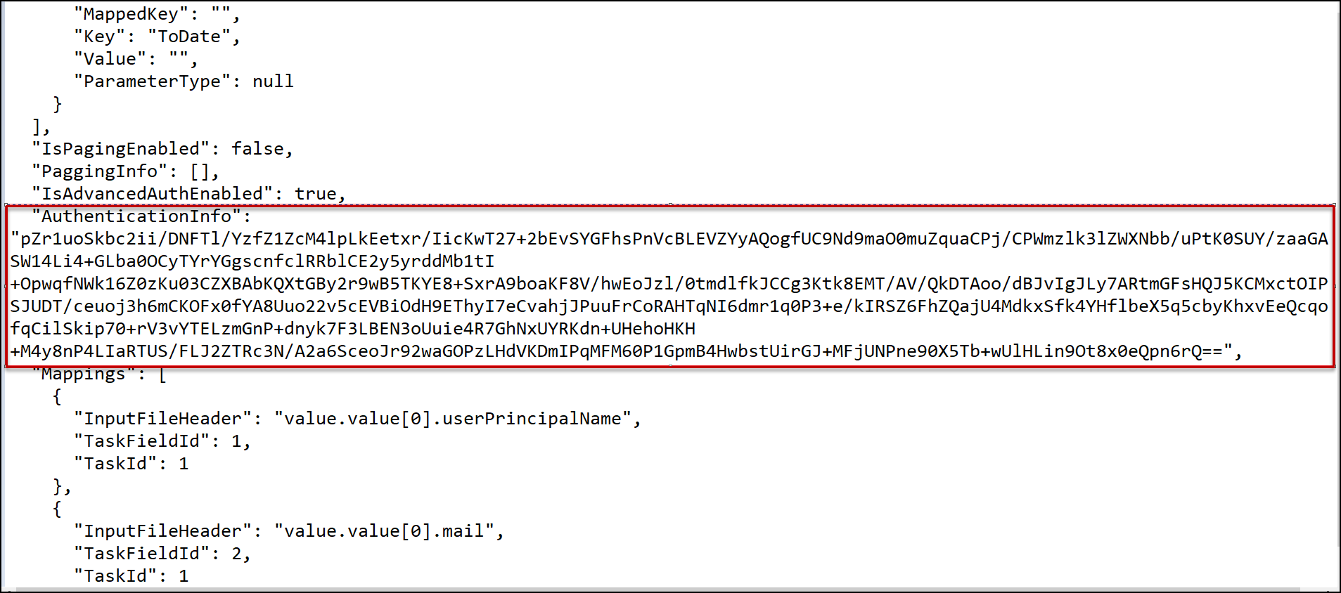 - Select the appropriate file path for storing the exported API Jobs. Exported API Jobs are saved as .txt files. Advanced Auth Info in Enabling the Bearer Token are saved as .txt files in encrypted format as shown in the following screenshot outlined in red.